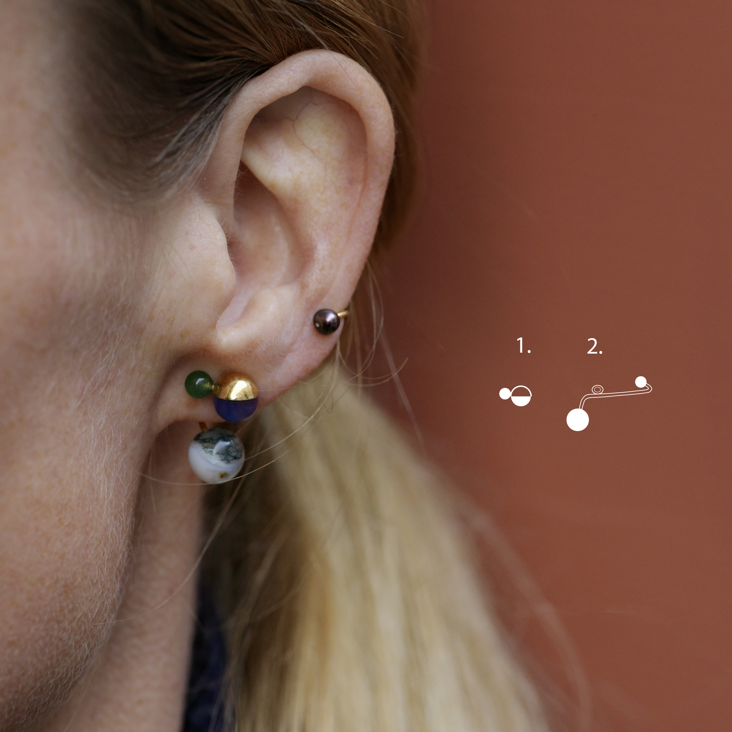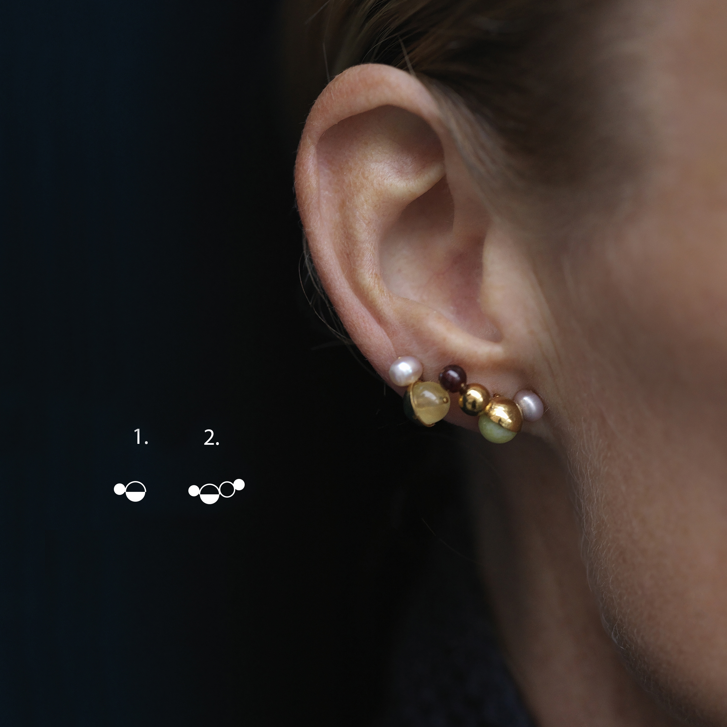 You can play around with combining the different pieces and make your personal favourite. The idea is that you can use them asymmetrical and wear different size and color in each ear, but you can also buy to similar and get a more classic look