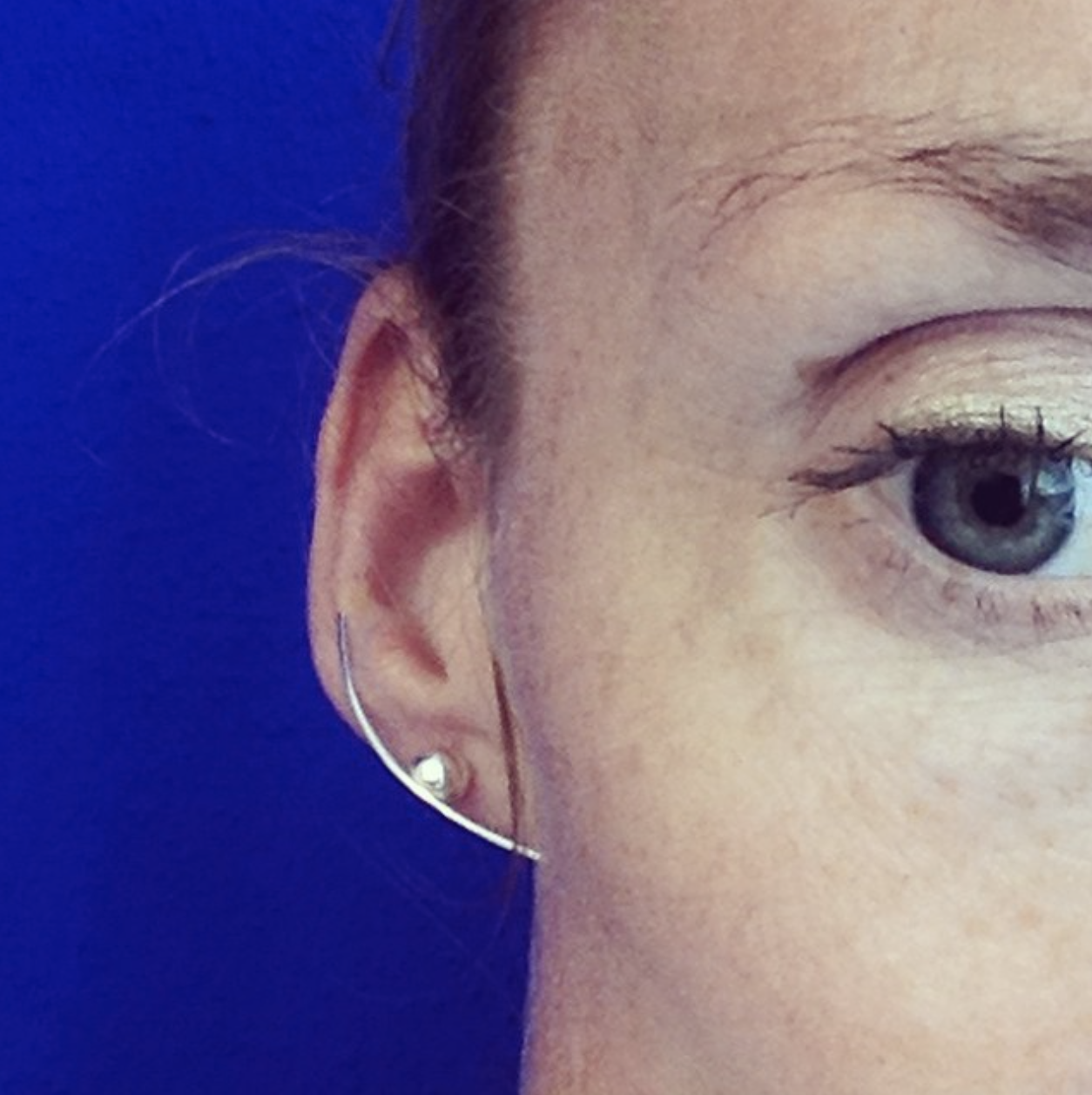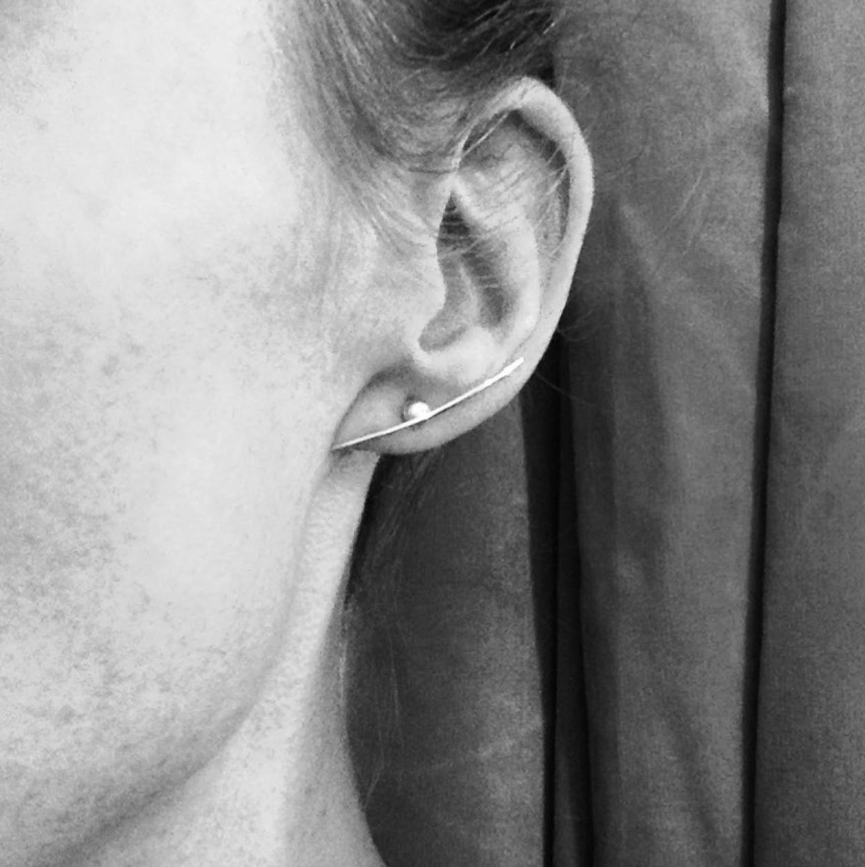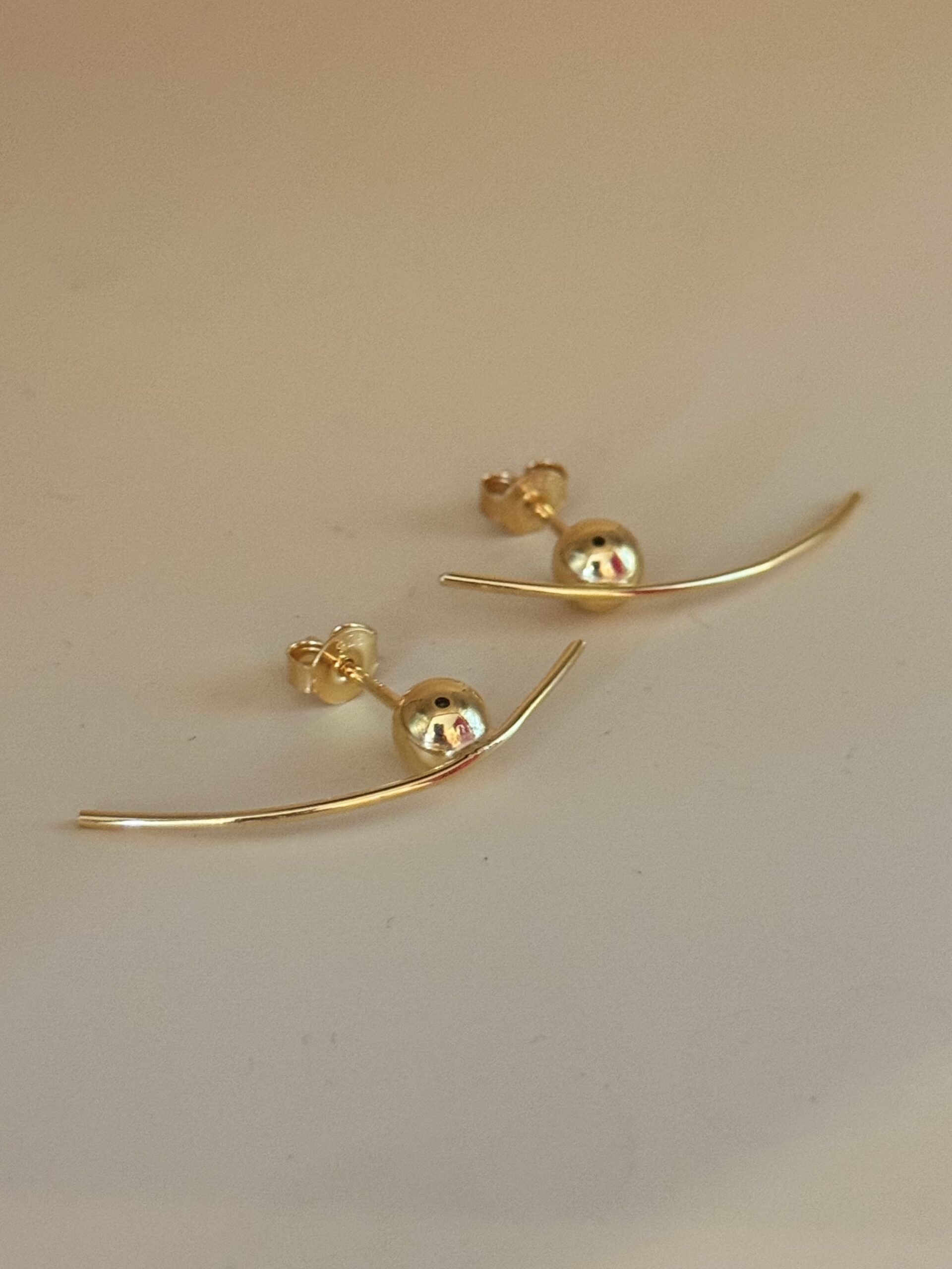 A classic ball earring with a twist. The thread goes above the ball and follows the earlobe … making classic lady-like to a more modern and edgy